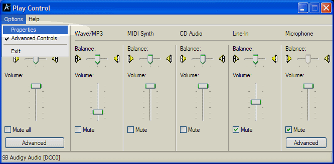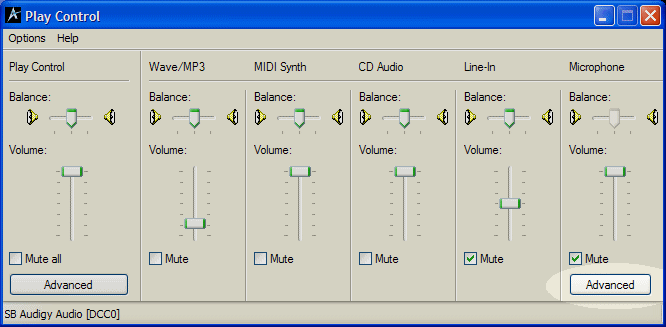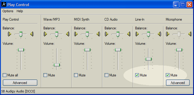 Put a Check the Line-in and Microphone "Mute" check boxes like below