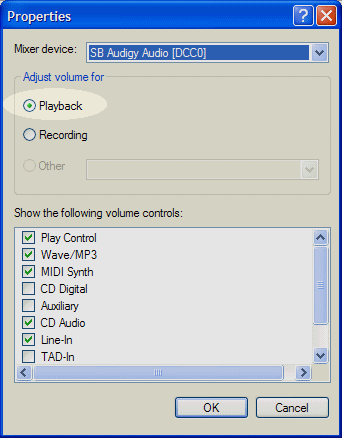Click on the "Playback" radio button. Make sure that the "Line-in" and "Microphone" controls are checked. Then Click <OK>