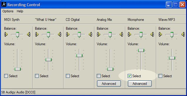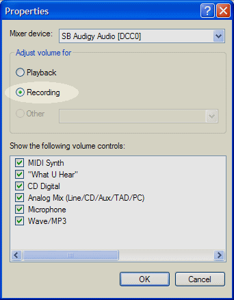 Click on the "Recording" radio button Make sure that the "Microphone" controls are checked. Then Click <OK>