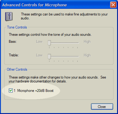 Put a check in the box at the bottom giving your microphone a +20db boost (This may not be needed for USB microphones. But this is where the microphone boost is if a USB microphone does need the boost.) Then click <Close>